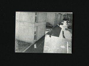Les villas se suivent en 6 blocs identiques et immaculés, rythmés par des fenêtres verticales, quelques tags à la craie des prénoms aux entrées. L’allée goudronnée traverse ce qu’on appelle le village, où se mêlent les jeux et les disputes, où se croisent les départs et les arrivées. Entre les buissons ordonnés, dans les fissures du bitume, subsistent parmi d’autres, quelques pissenlits. »