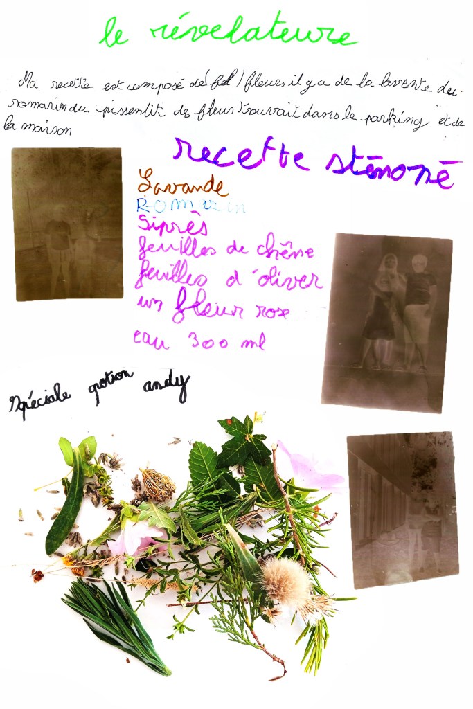 En résidence de création à SOS Village d’Enfants à Besse-sur-Issole, j’ai suivi durant deux semaines les habitant.es dans leur quotidien et conçu avec elle.eux des chimies photographiques en glanant des fleurs et végétaux trouvés sur le parking du foyer, créant un laboratoire argentique au sein de la structure sociale. Fleurs de Parking s’inscrit dans la volonté de penser la création artistique intrinsèquement liée aux problématiques sociales, territoriales et écologiques, valoriser l’expérience intime et organique, s’autonomiser en s’adaptant aux ressources présentes, à travers le tissage de liens humains et dans l’apprentissage de procédés résilients.